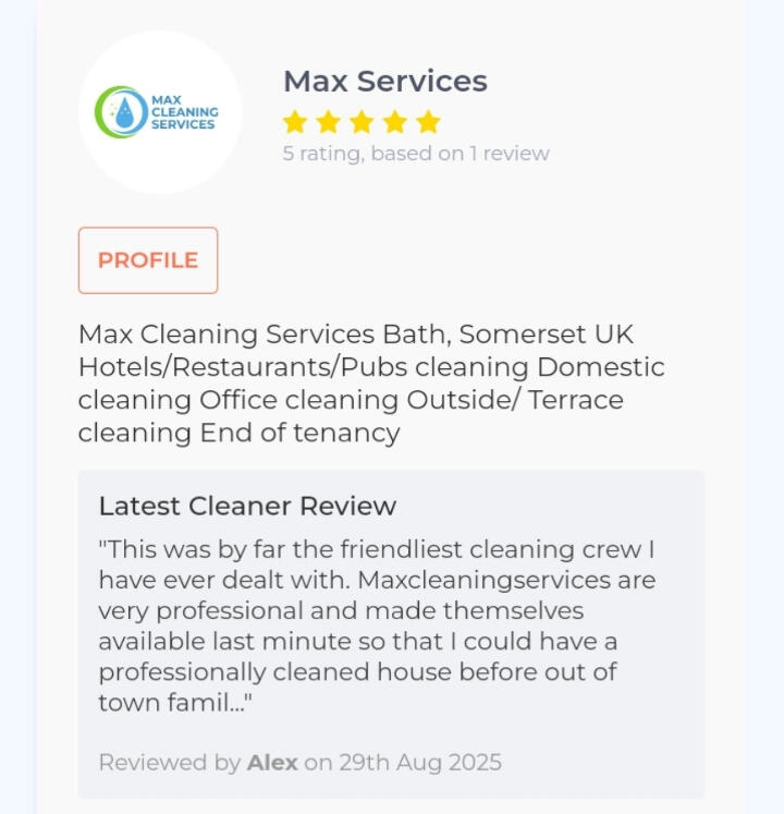 This was by far the friendliest cleaning crew I have ever dealt with. Maxcleaningservices are very professional and made themselves available last minute so that I could have a professionally cleaned house before out of town family arrived. I am going to continue to use them and already made my next appointment. Max is a lovely person, returned my call immediately and his crew did an immaculate job! I am so thrilled I found this wonderful cleaning service!! ⭐⭐⭐⭐⭐Respond to this review. MyJobQuote 04.09.2025